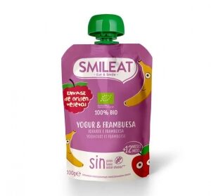 POUCH YOGUR Y FRAMBUESA ECO SIN AZUCARES AÑADIDOS +12 MESES 100GR SMILEAT – Caja de 10 Unidades