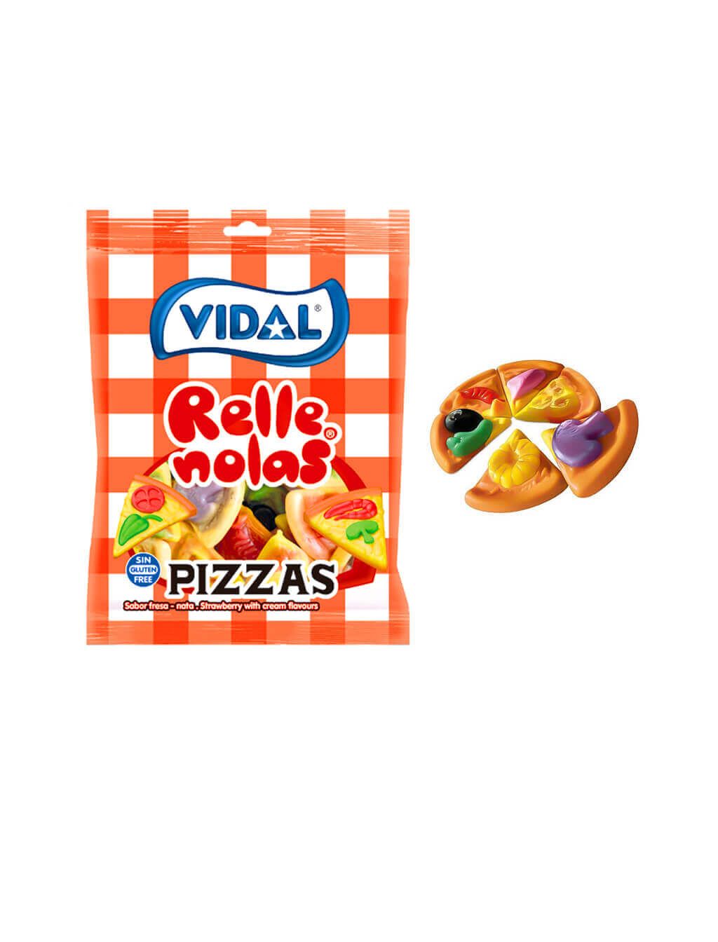 Pizza rellenas de la marca Rellenolas con nuestro inconfundible relleno de gelatina y un intenso sabor a fresa. Las Rellenolas son piezas originalmente creadas por Vidal Golosinas con una doble textura que te sorprenderá acompañada de un suculento sabor.
