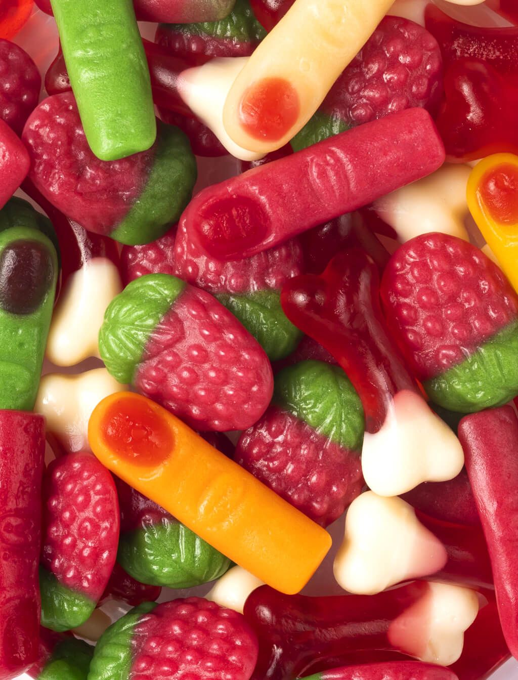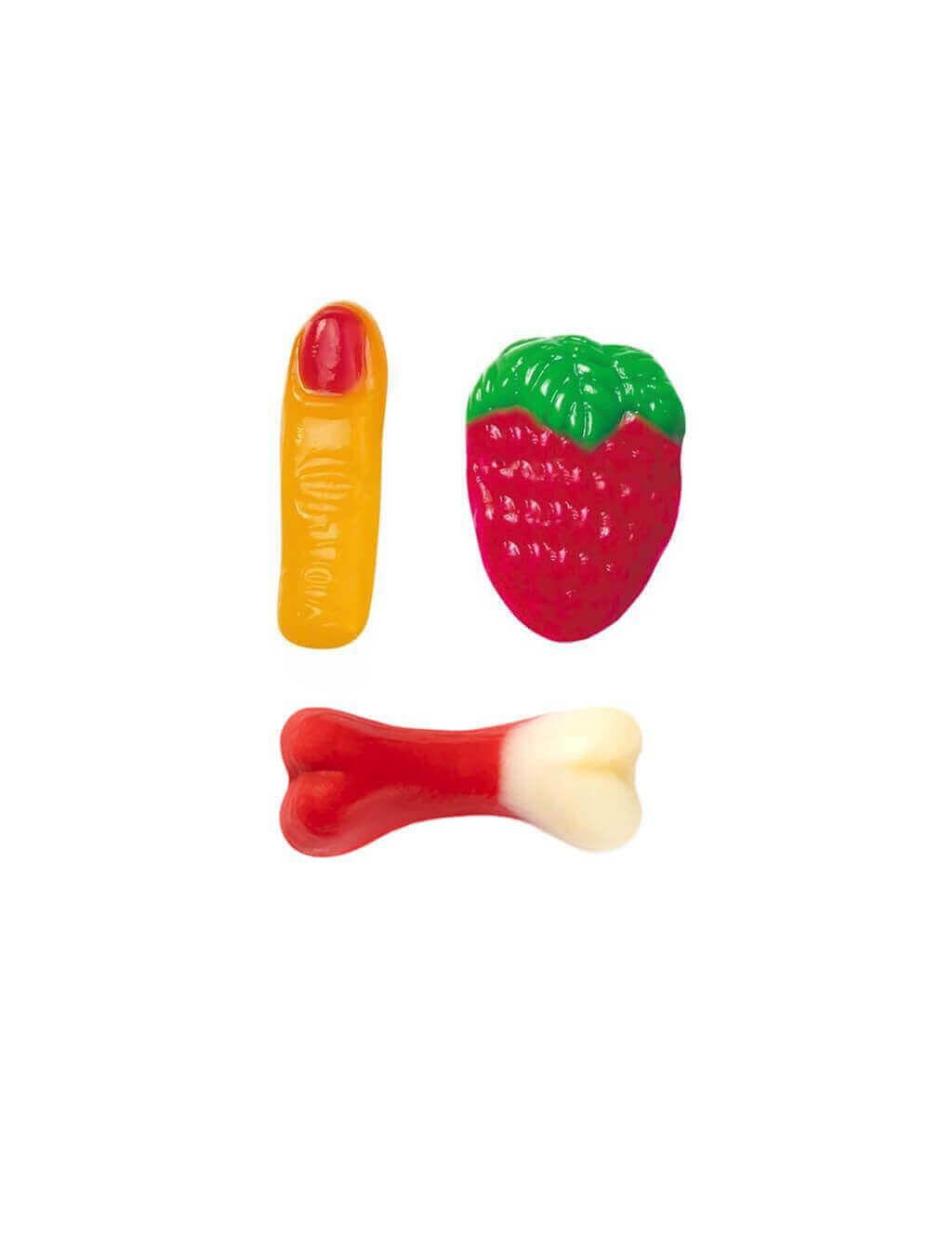 Una deliciosa selección de golosinas Vidal: dedos de colores, fresas silvestres y huesos, listos para conquistar los paladares más exigentes. Predomina el sabor fresa.
