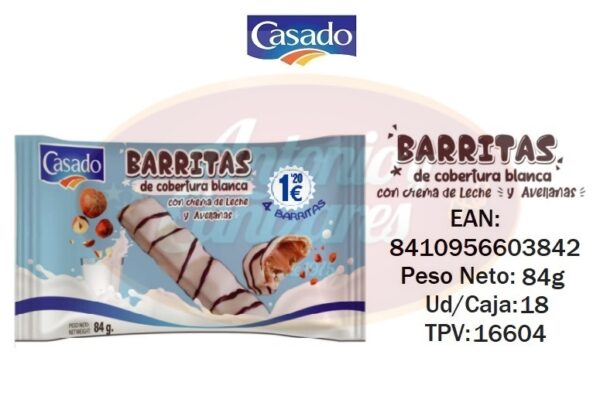 Barritas de Cobertura Blanca con Crema de Leche y avellanas – Peso Neto 84gr Casado – Caja de 18 Unidades