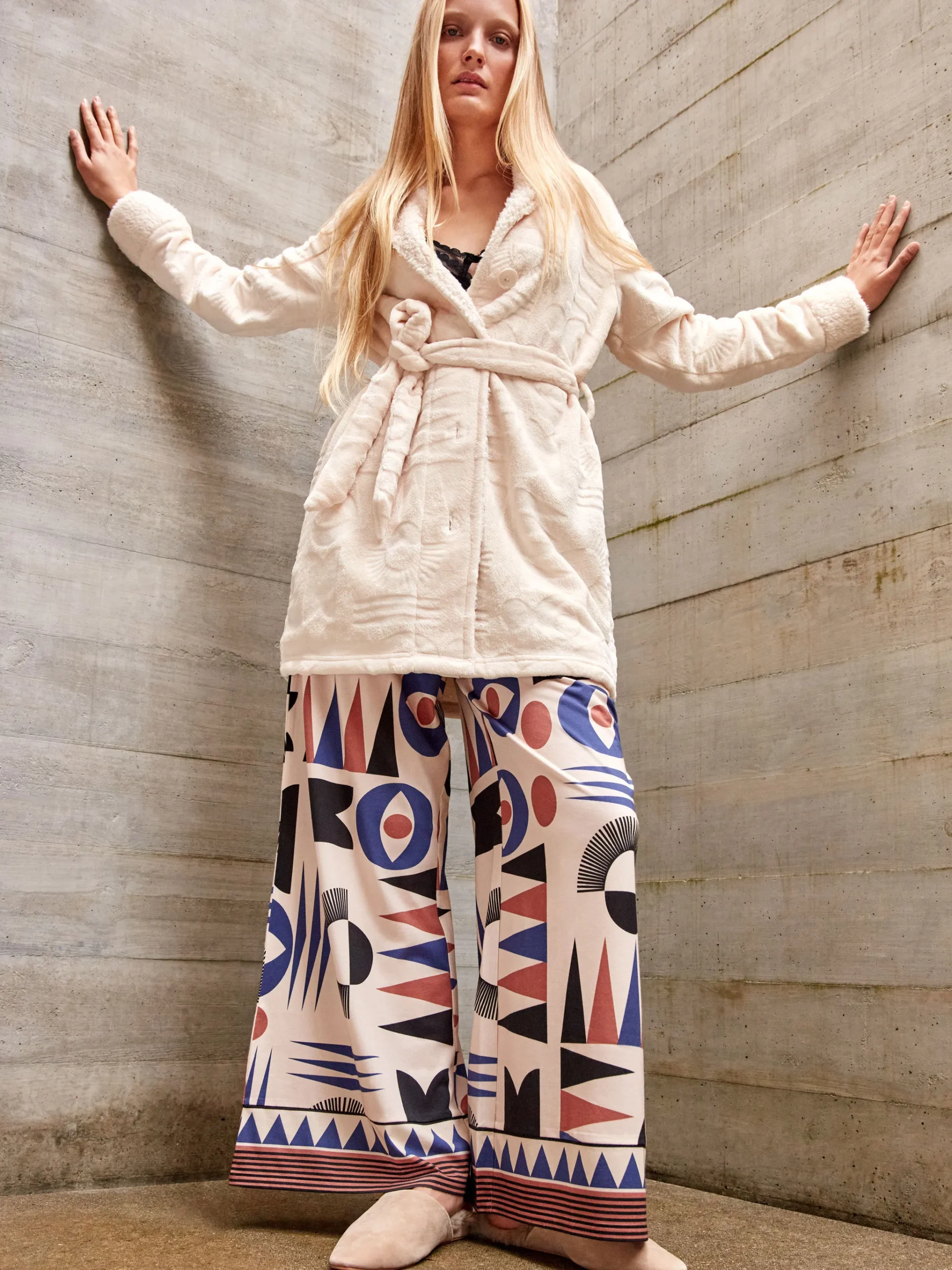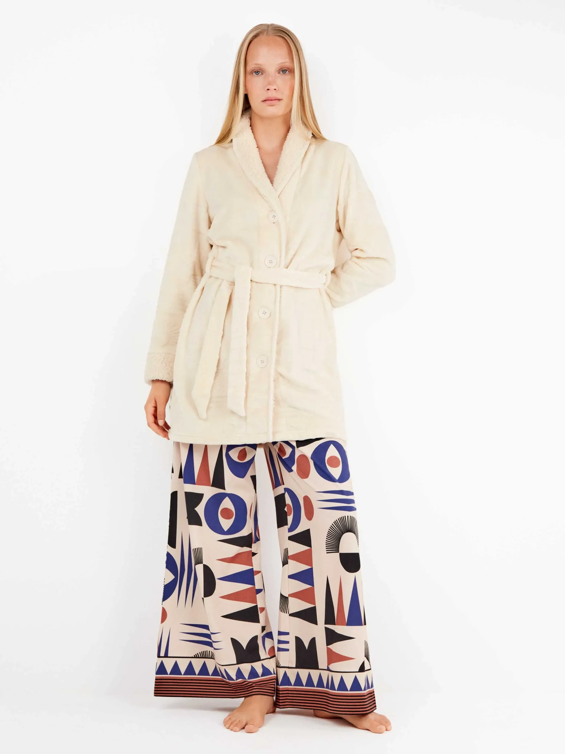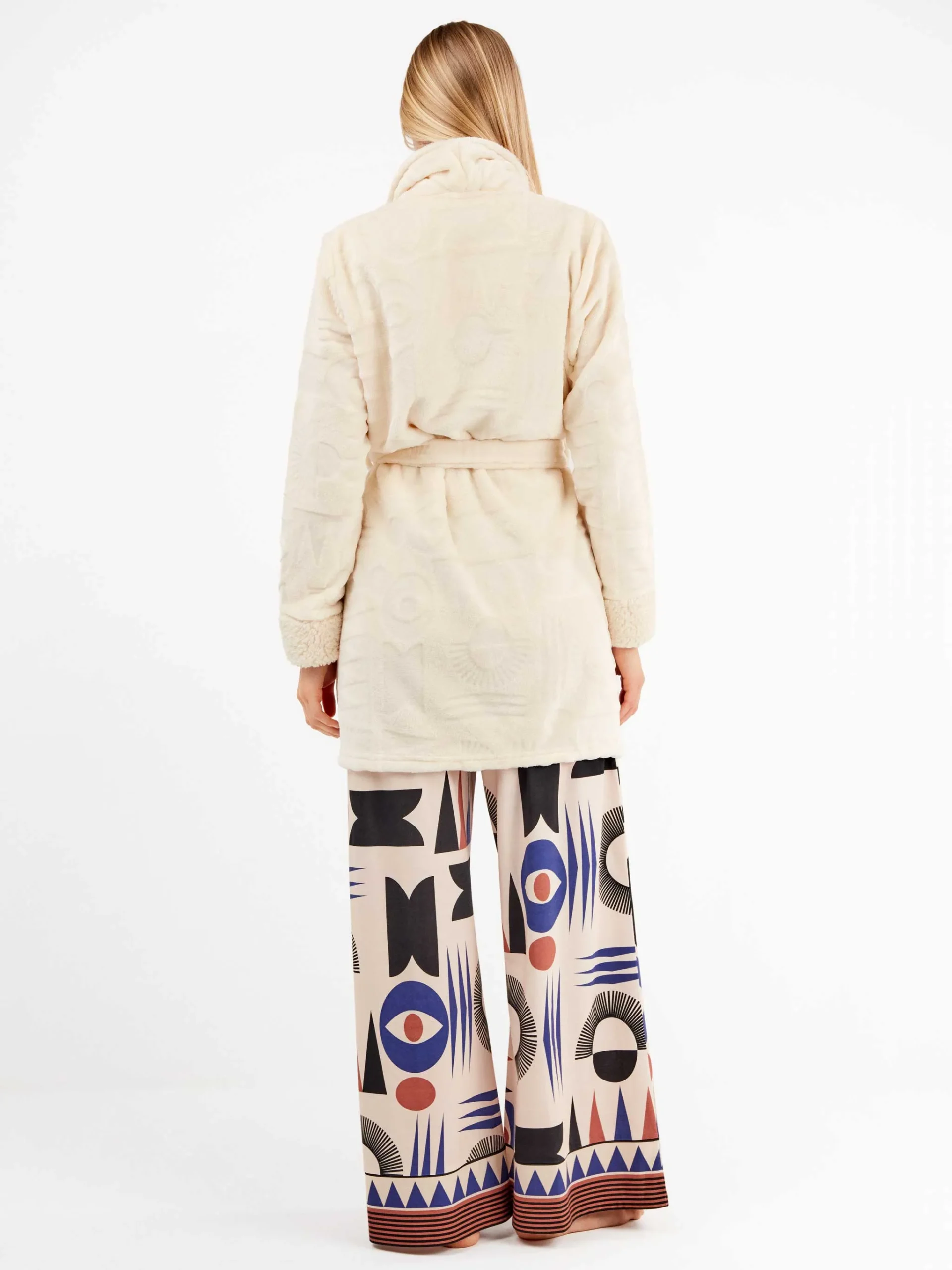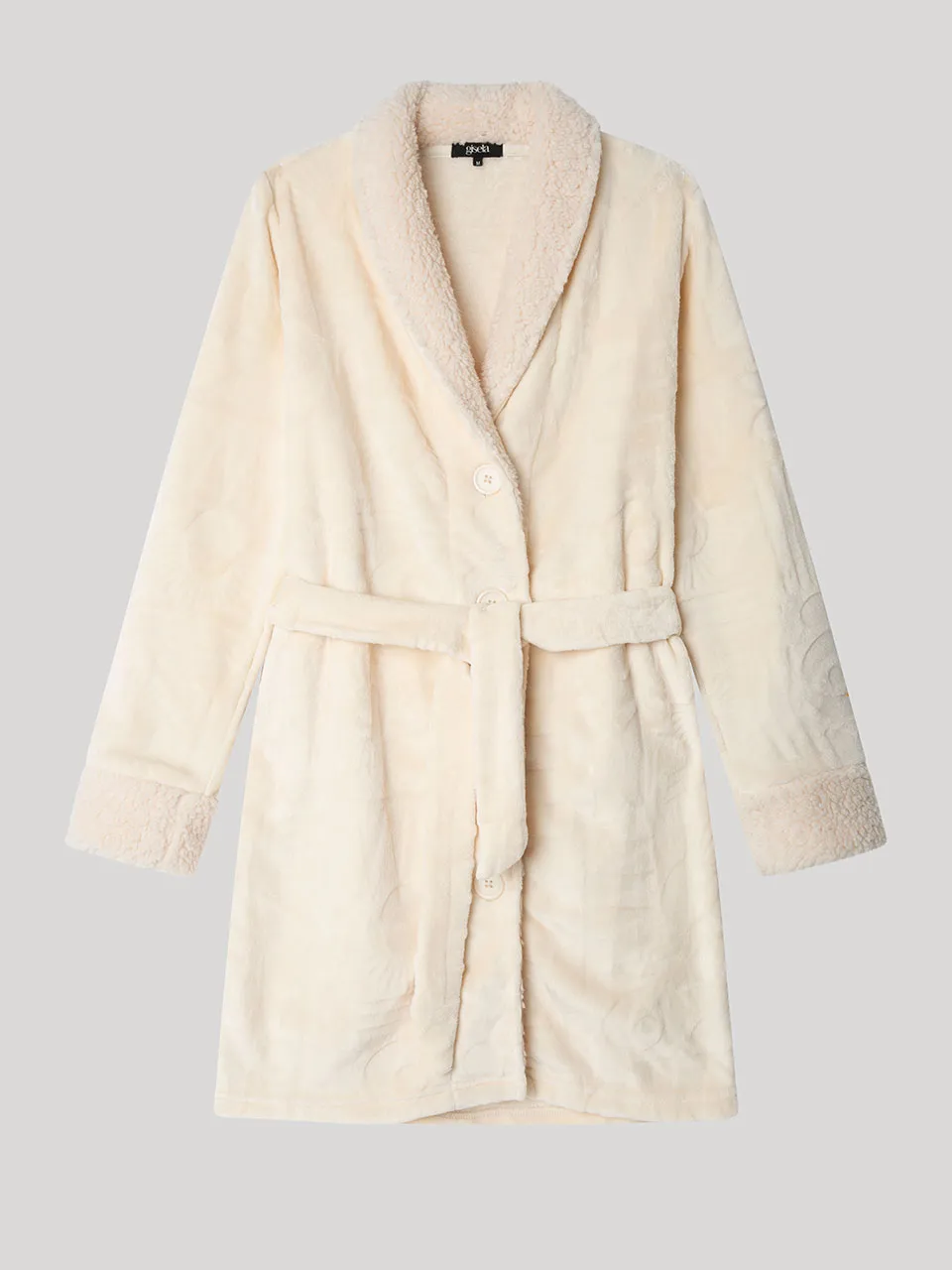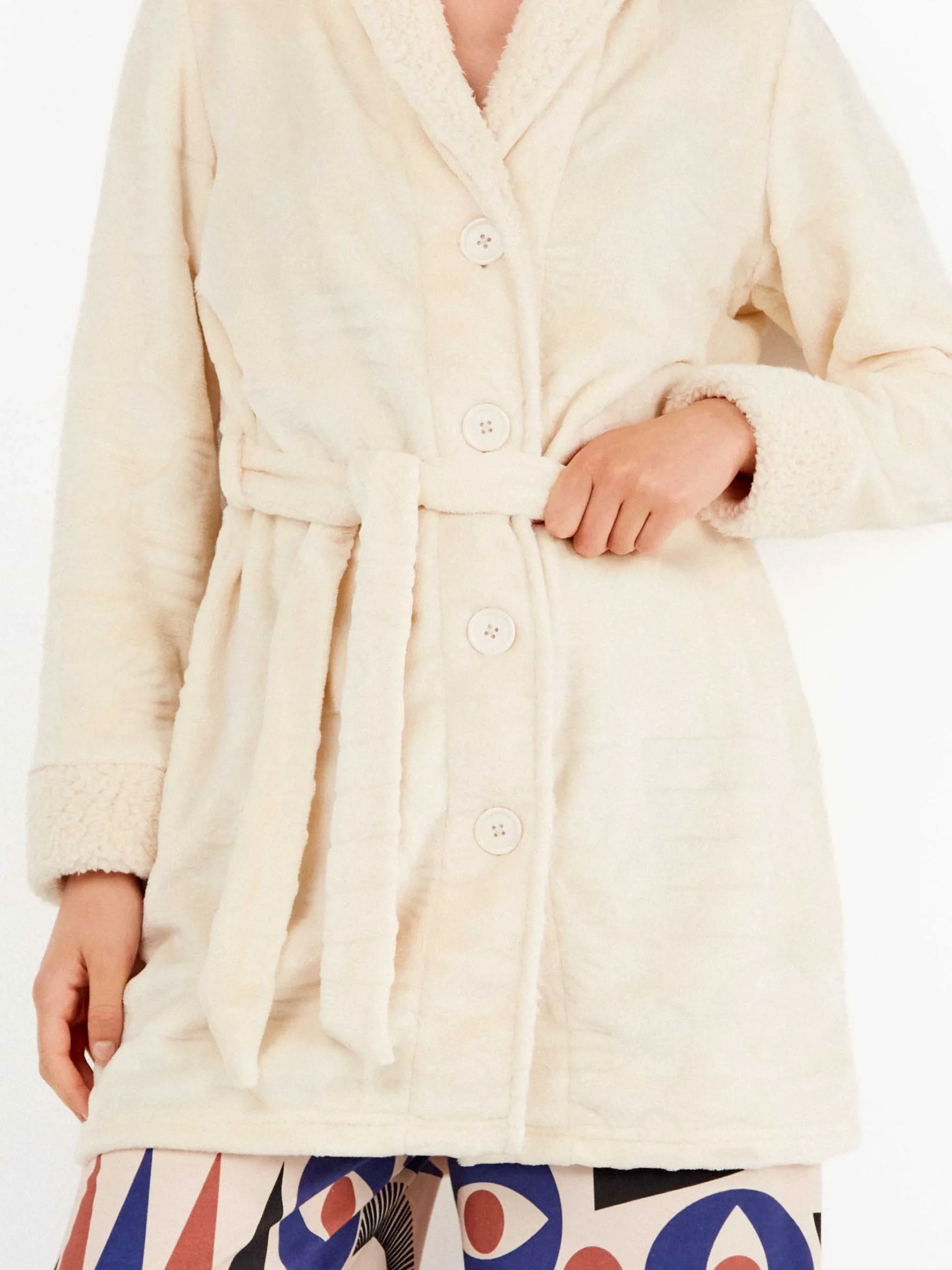 Bata en tejido peluche en la que aparecen grabadas formas geométricas en relieve con botones delanteros, cuello y puños a contraste y anudada en cintura.