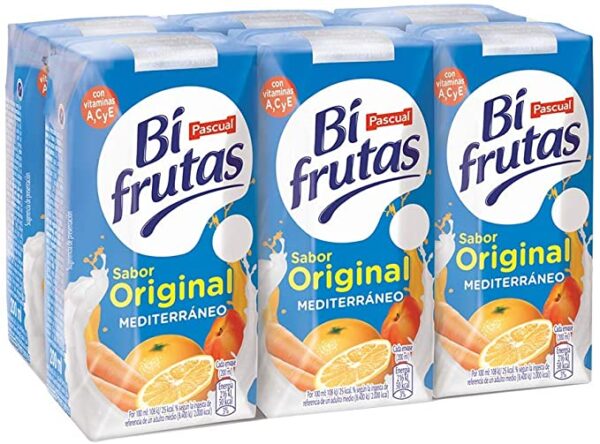 Bebida refrescante mixta de zumo de frutas y hortaliza y leche, con azúcar y edulcorante y con vitaminas C, E y A.