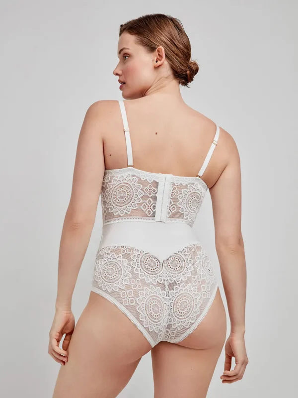 Body de encaje tipo crochet in & out. Con aro, foam, tirantes desmontables y trasero efecto tanga. Cierre trasero de corchetes. Disponible en copas B y C.