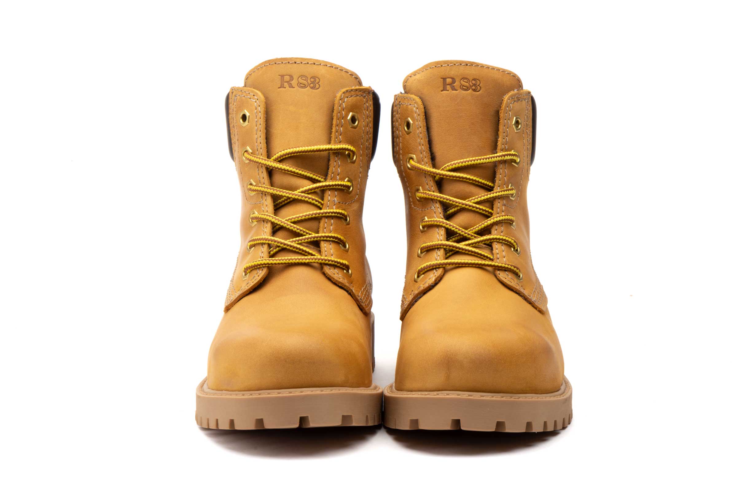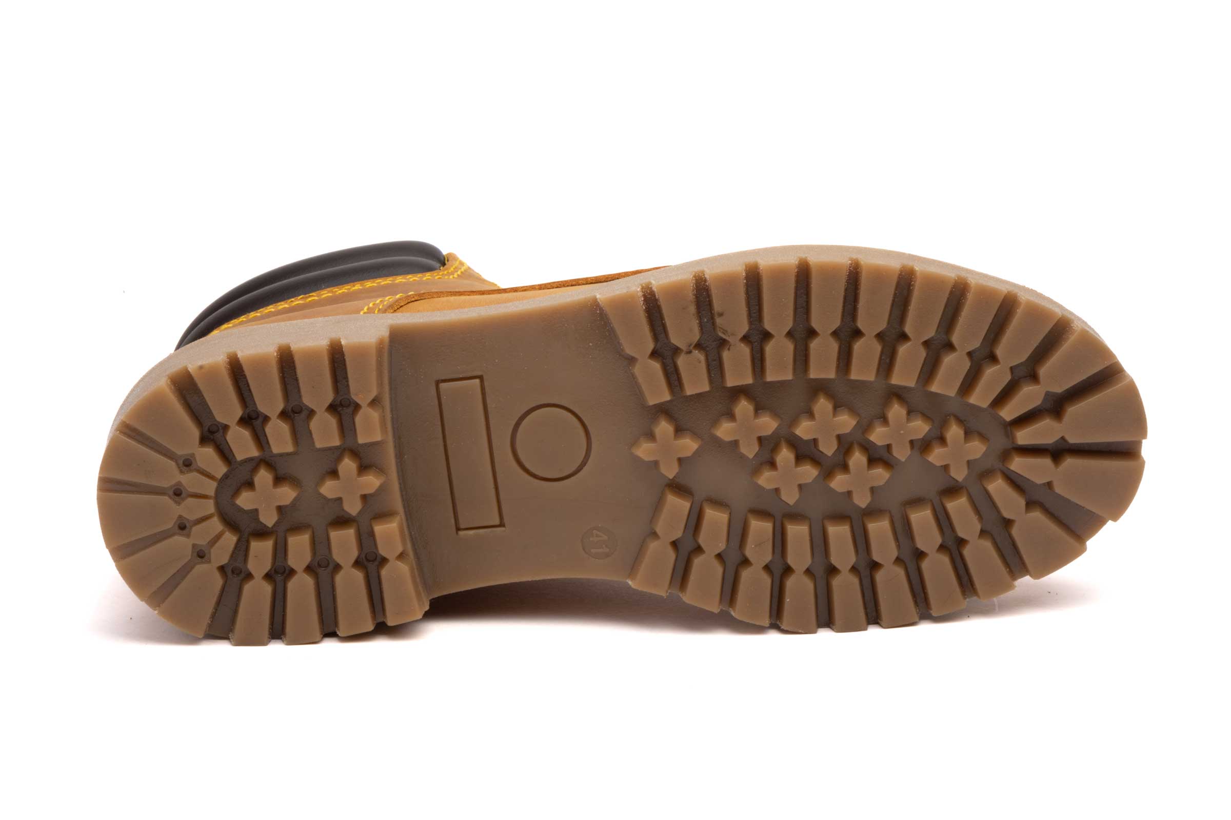 Botas robustas en tono marrón miel panamá, ideales para actividades al aire libre y estilos urbanos. Estas botas, con un diseño atemporal, están confeccionadas en cuero de alta calidad, asegurando resistencia y durabilidad. El collarín en contraste de color oscuro ofrece un soporte y comodidad adicionales al tobillo. Los cordones amarillos dorados aportan un toque distintivo, combinando perfectamente con las ojales metálicos. La suela dentada garantiza un agarre firme en diversas superficies. El sello ‘R83’ y un pequeño logotipo en relieve realzan la autenticidad y el prestigio de la marca Route 83.