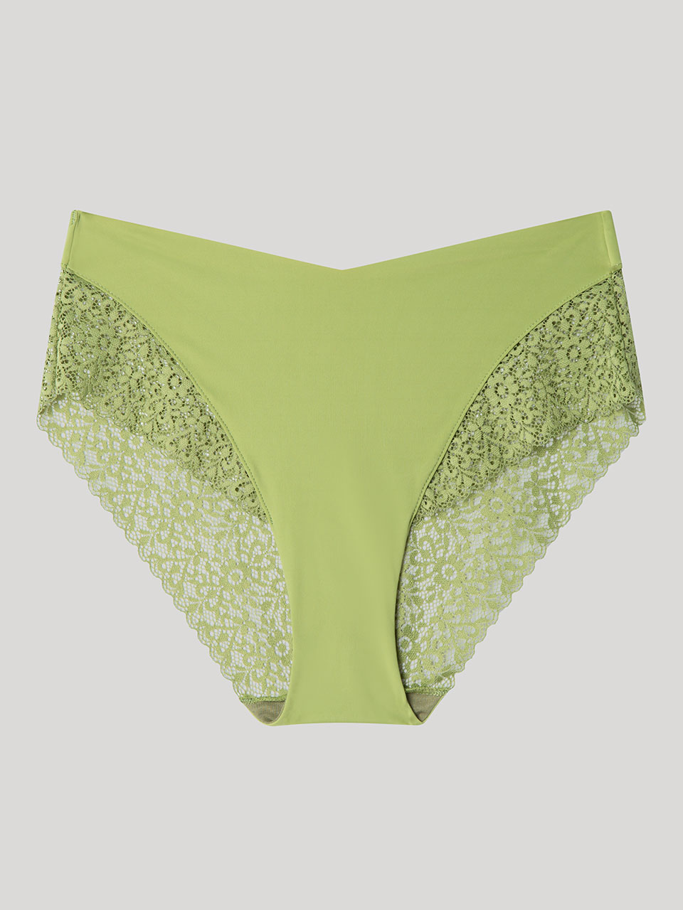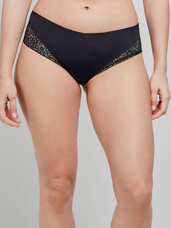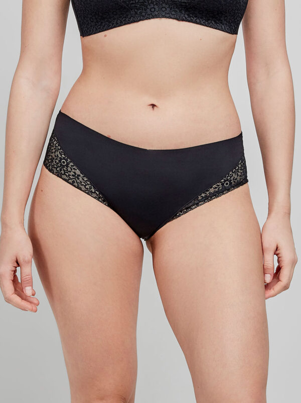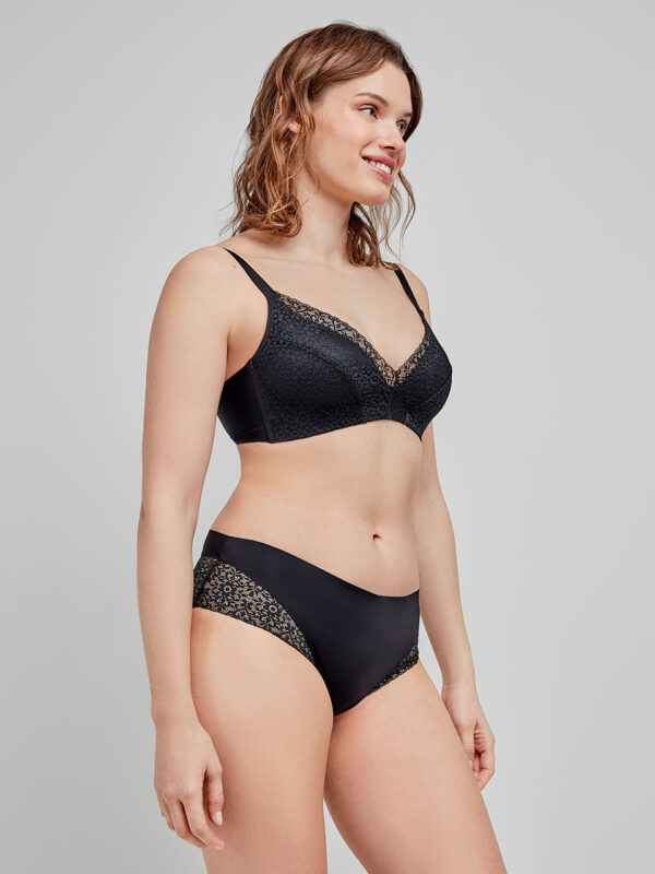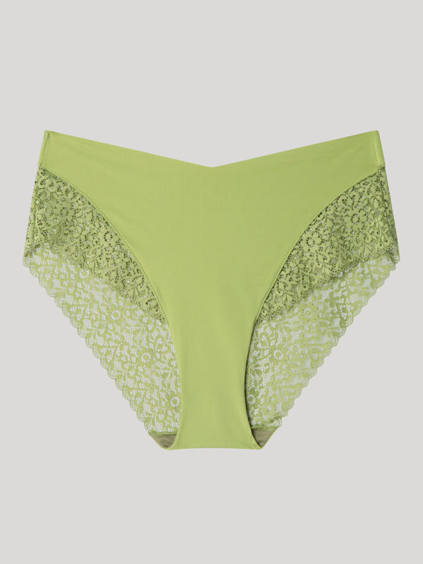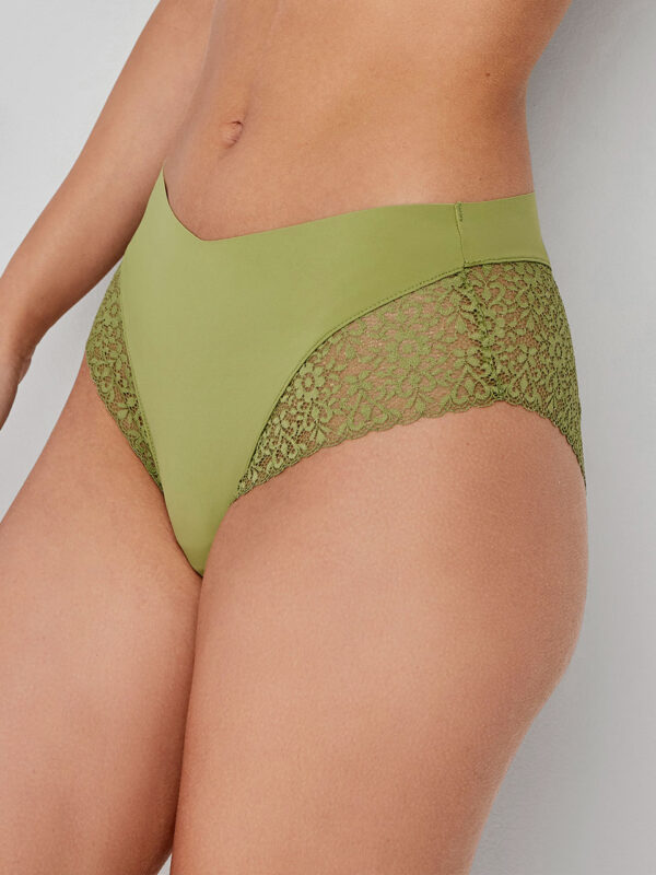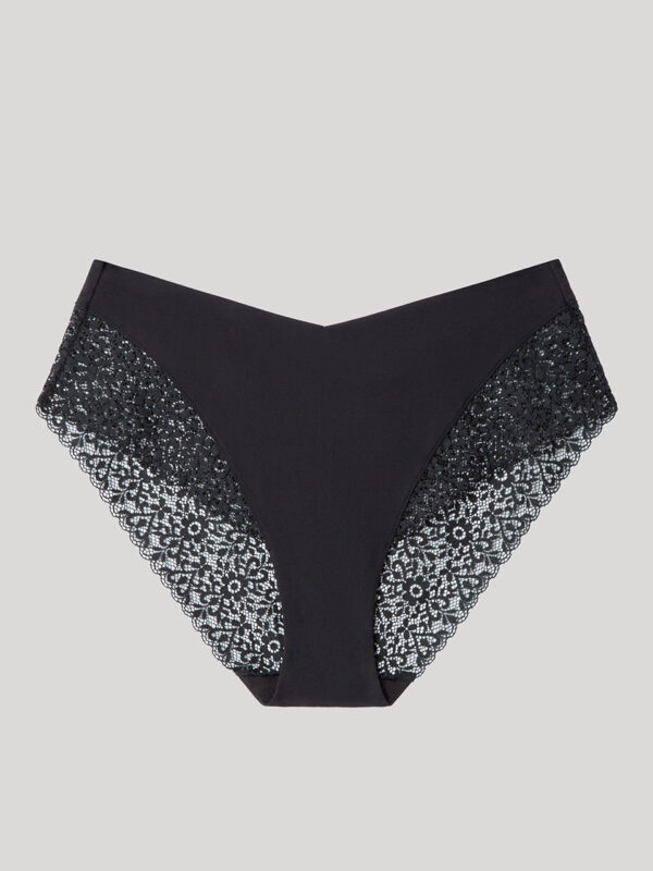 Braguita alta en tejido de encaje extraplano con acabados sin costuras que evita marcas bajo la ropa. Disponible en dos colores. Combínala con su sujetador a juego.