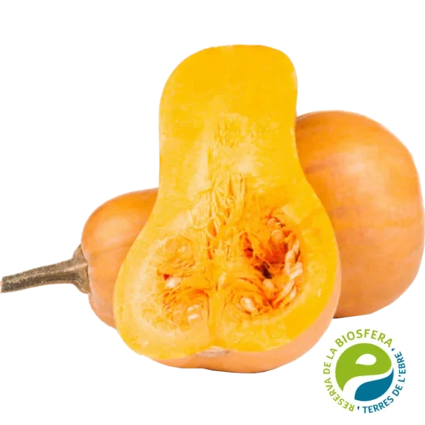 La calabaza violín, también llamada calabaza cacahuete, es una variedad alargada, de piel dura y color anaranjado o marrón claro, que recuerda la forma de un violín o un cacahuete, de ahí su nombre. Su pulpa es de un intenso color naranja, dulce, firme y con un sabor suave, a menudo con notas a nuez o frutos secos, ideal para cocinar en cremas, asada, o en postres. Es rica en nutrientes como vitaminas A y C, y se conserva bien durante meses en un lugar fresco y seco.