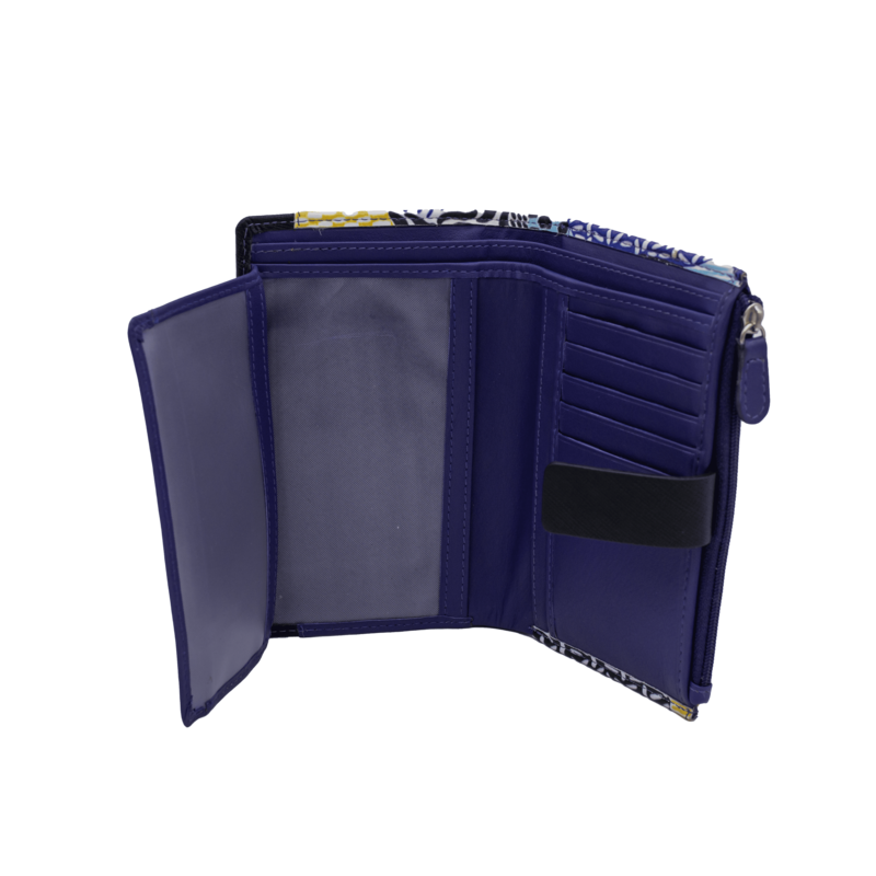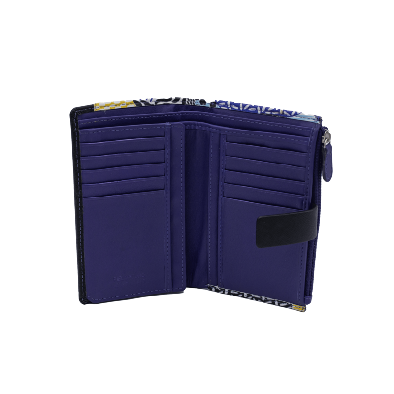 Cartera en piel de vacuno lisa, grabada y estampada. Tiene doble billetero, cinco compartimentos para tarjetas, un bolsillo extra y dos ventanas. Cuenta con un monedero de solapa de gran capacidad y un segundo monedero de cremallera en su interior para evitar la caída de las monedas.