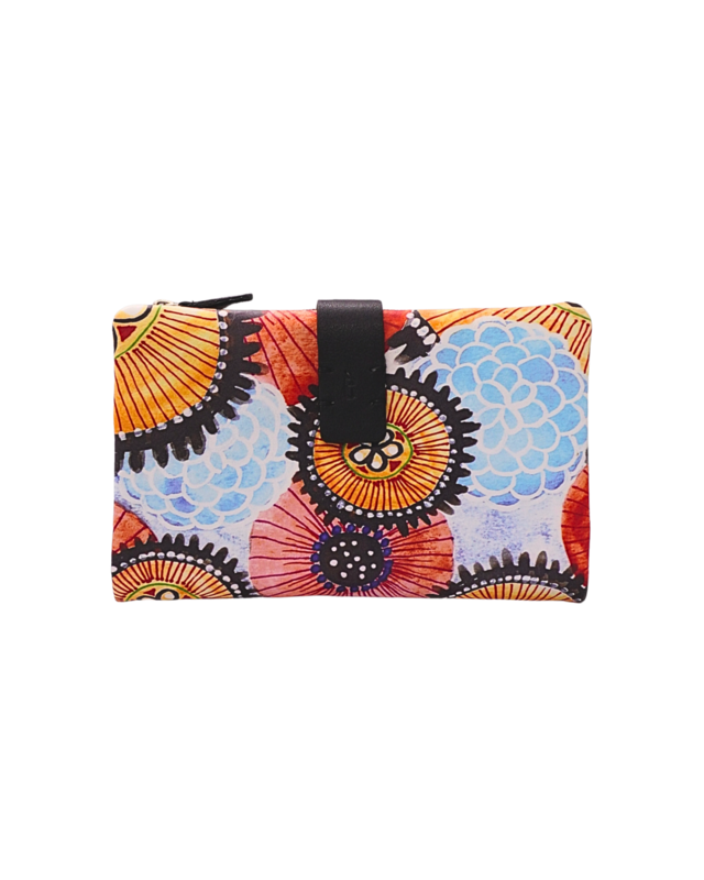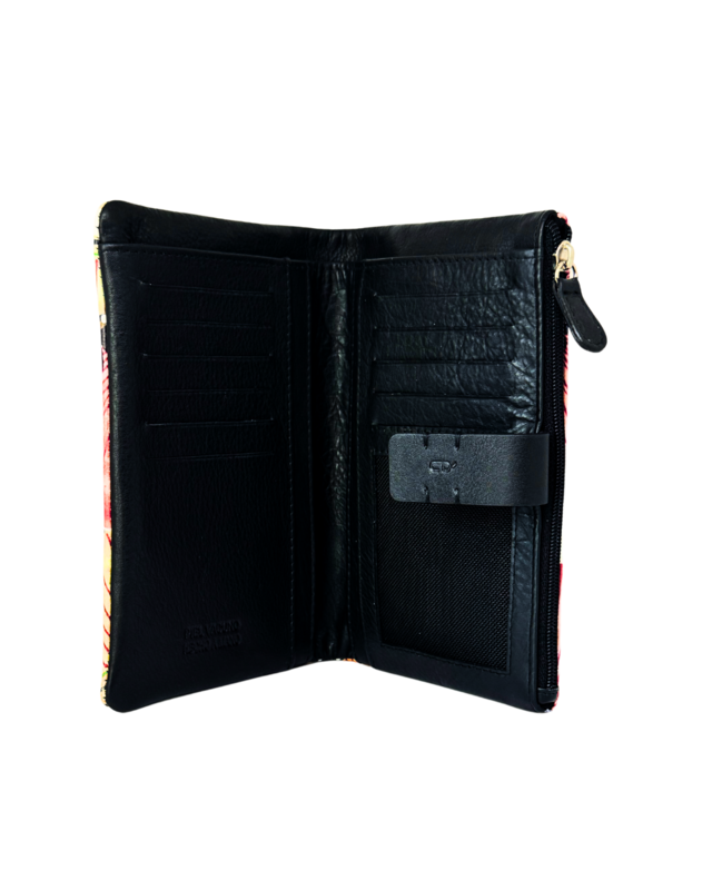 Cartera de tamaño grande en piel de vacuno y estampado inspirado en la cultura japonesa. Tiene diez compartimentos para tarjetas, una ventana para documentos como DNI y cuatro bolsillos extra. Monedero con cierre de cremallera para monedas.