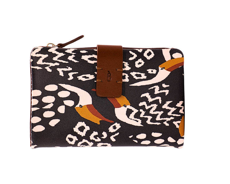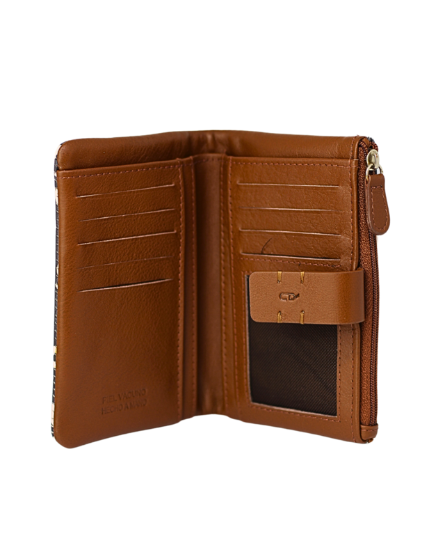 Cartera de tamaño mediano en piel de vacuno y estampado estilo animal print. Tiene ocho compartimentos para tarjetas, una ventana para documentos como DNI y cuatro bolsillos extra. Además, tiene espacio para billetes y monedero con cierre de cremallera para monedas.