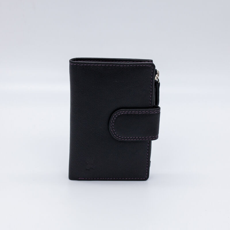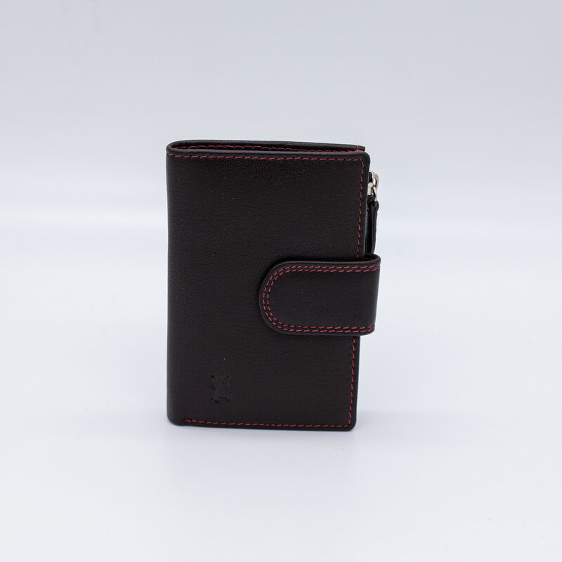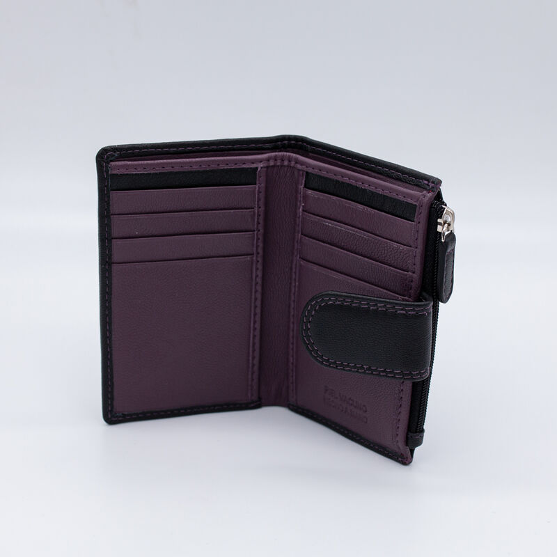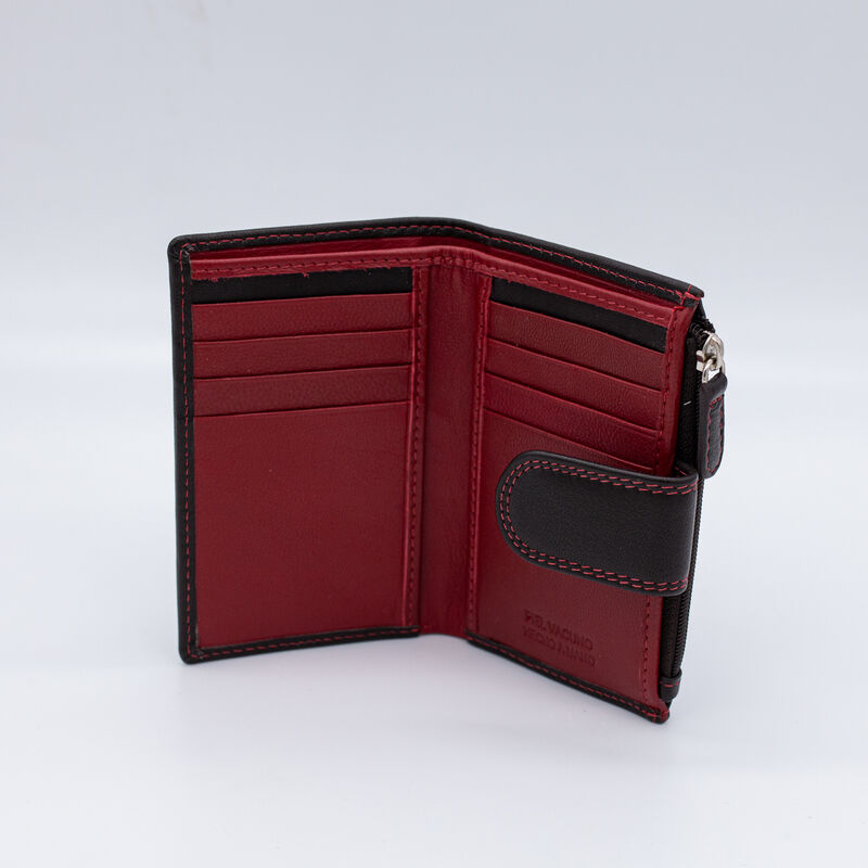 Cartera compacta pero muy completa fabricada en piel de vacuno. Tiene billetero, ocho compartimentos para tarjetas y dos bolsillos extra. Incluye monedero exterior con cierre de cremallera.