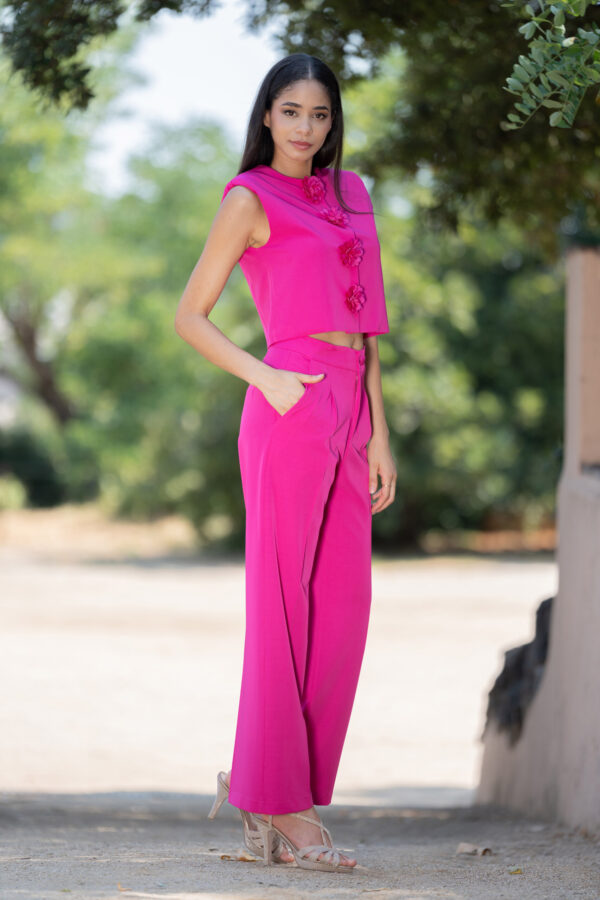 • Chaleco forrado con hombreras y botones flor al tono