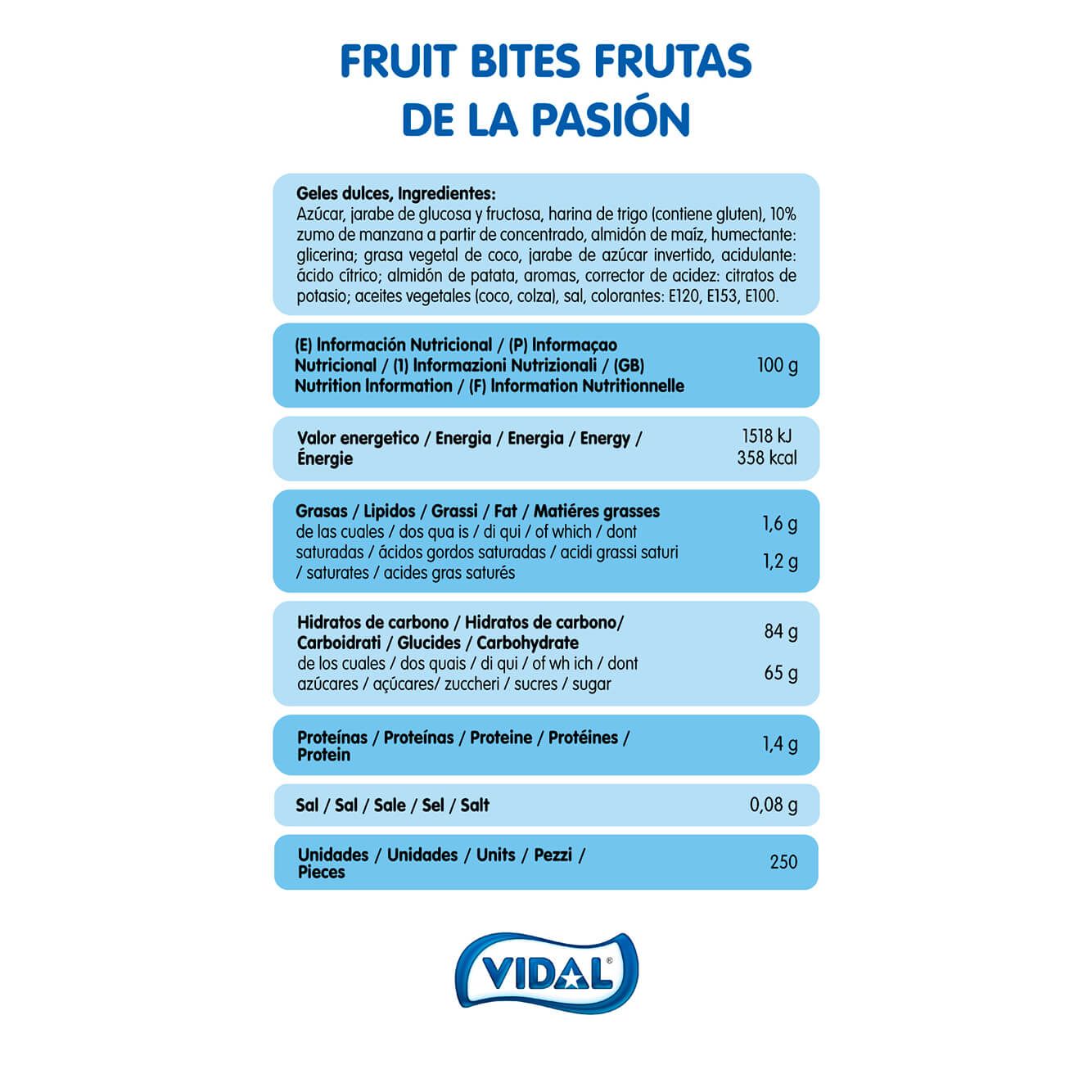 Ingredientes: azúcar, jarabe de glucosa y fructosa, harina de trigo (contiene gluten), 10% zumo de manzana a partir de concentrado, almidón de maíz, humectante: glicerina; grasa vegetal de coco, jarabe de azúcar invertido, acidulante: ácido cítrico; almidón de patata, aromas, corrector de acidez: citratos de potasio; aceites vegetales (coco, colza), sal, colorantes: E120, E153, E100.