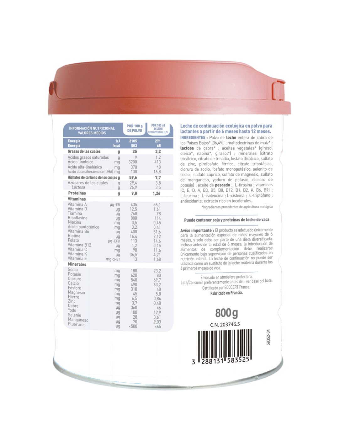 Polvo de leche entera de cabra de los Países Bajos* (34,8%); maltodextrinas de maíz*; lactosa de cabra*; aceites vegetales* (colza*, girasol*, girasol oléico*); aceite de pescado (proteínas de leche; minerales (carbonato cálcico, fosfato dipotásico, cloruro de magnesio, cloruro de sodio, sulfato ferroso, cloruro de potasio, sulfato de cinc, hidróxido de potasio, selenito de sodio, sulfato cúprico, sulfato de manganeso, yoduro de potasio); aceite de Mortierella alpina; vitaminas (L-ascorbato sódico, colecalciferol, nicotinamida, D-pantotenato cálcico, acetato de retinilo, D-biotina, fitomenadiona, mononitrato de tiamina, clorhidrato de piridoxina, ácido fólico, acetato de D-alfa tocoferilo, DL-alfa tocoferol, 6-palmitato de L-ascorbilo, cianocobalamina, riboflavina); L-isoleucina; L-tirosina; L-leucina; L-cistina; L-triptófano; antioxidante: extracto rico en tocoferoles.