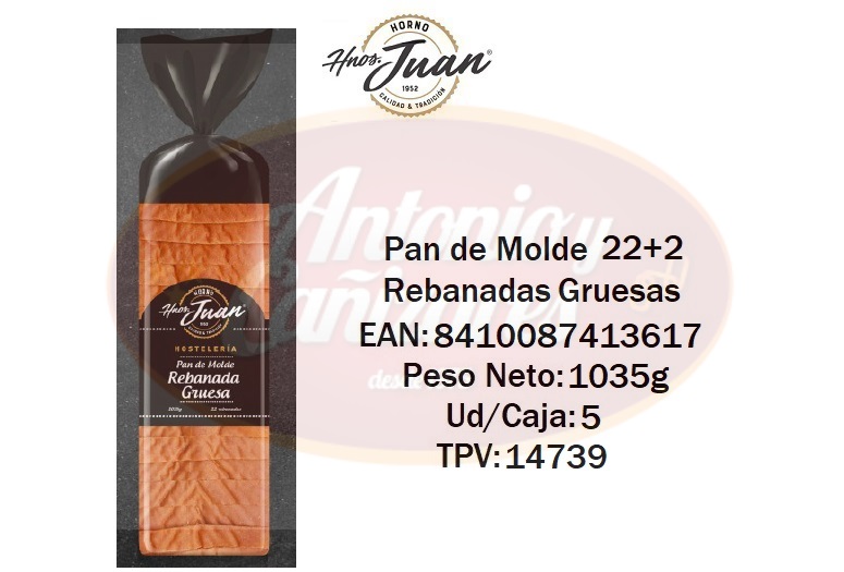 Pan de Molde 22+ 2 rebanada gruesa Hnos Juan – Peso Neto 1035 Grs. – Caja de 5 Unidades
