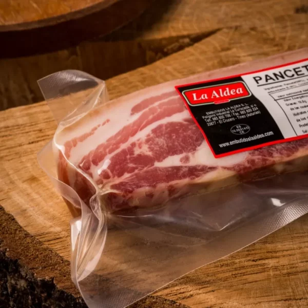 La panceta de cerdo en trozos «La Aldea» es un producto cárnico salado, deshuesado y curado, proveniente de la parte ventral del cerdoSe presenta en tacos de aproximadamente 300 gramos, envasados al vacío. Es ideal para añadir sabor a guisos como cocidos (alubias, lentejas, garbanzos) o para freír en lonchas, acompañando platos tradicionales o pescados.
