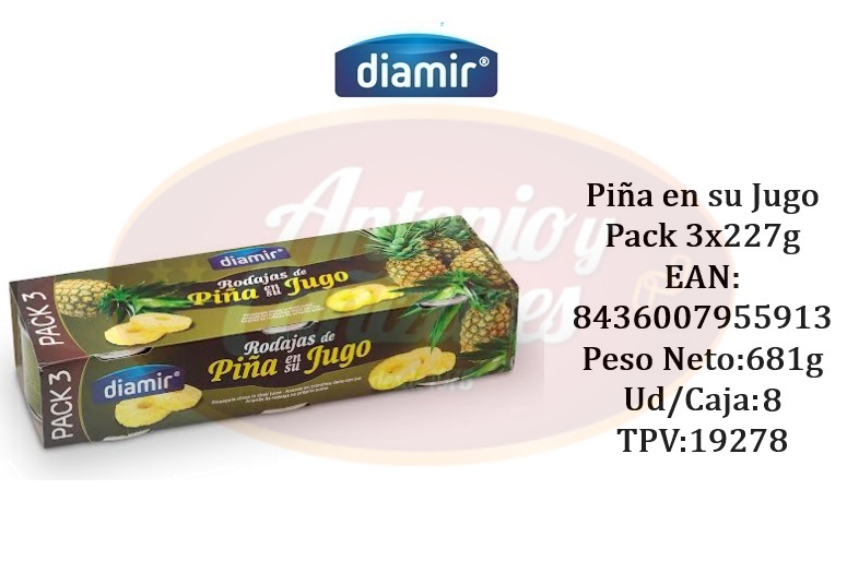 Piña en su jugo pack3 x 227 Gr Diamir – Peso neto 681 Gr – Caja de 8 Unidades