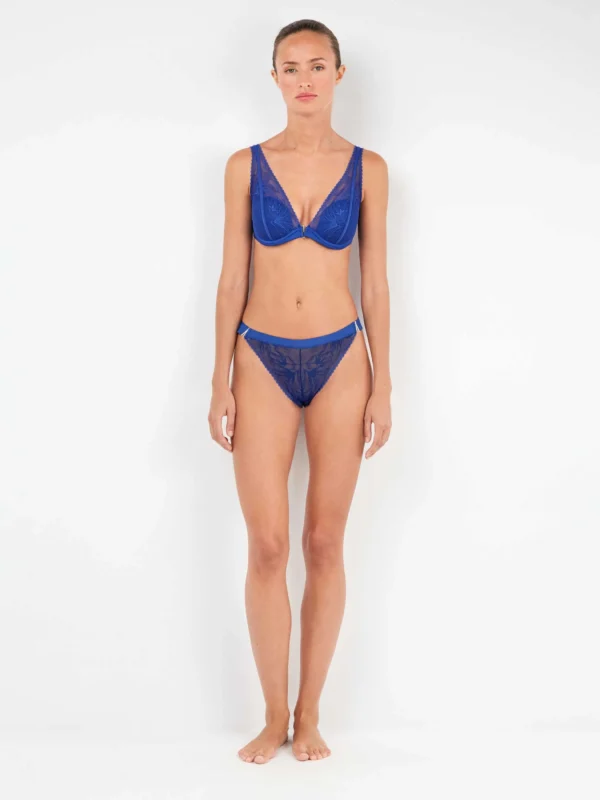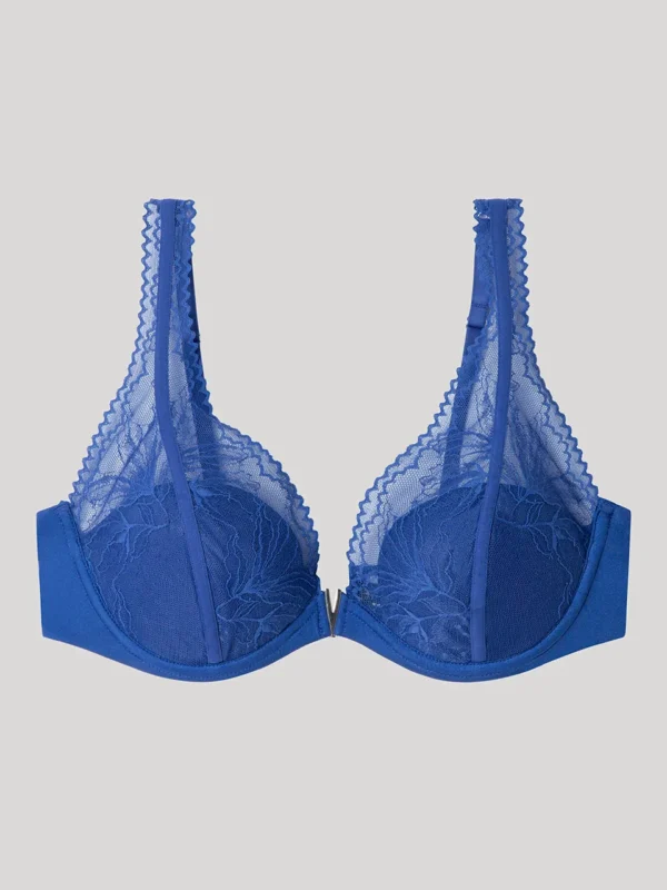 Sujetador bralette con copas estructuradas que realzan y refuerzan. Tejido de microfibra con detalles transparente de encaje, que junto a la pieza metálica en el pecho, convierte al sujetador en una prenda sensual y moderna