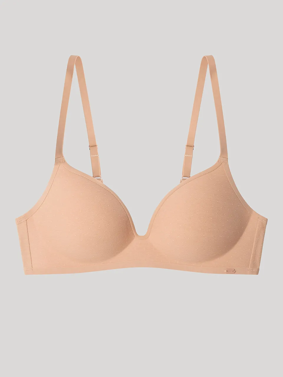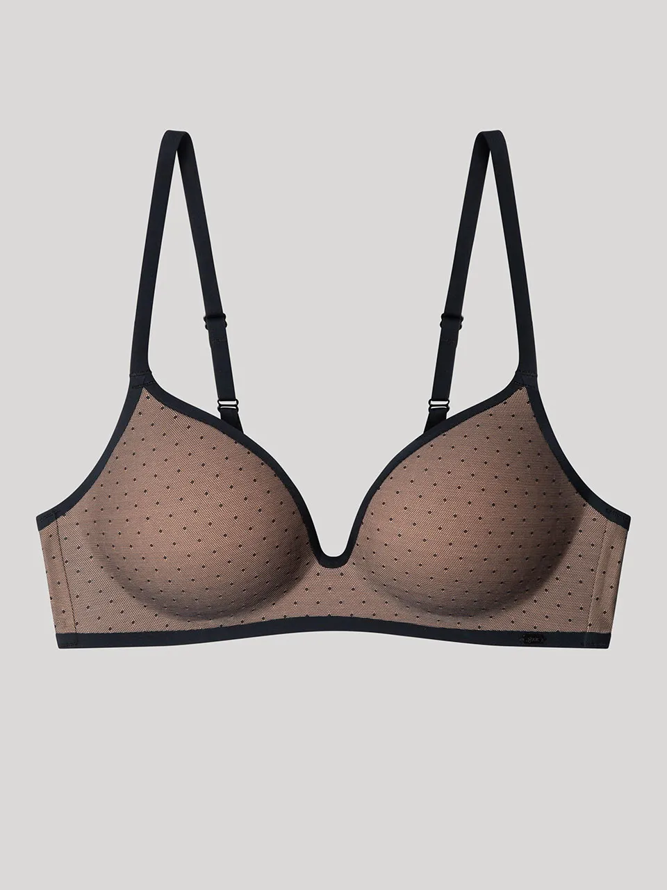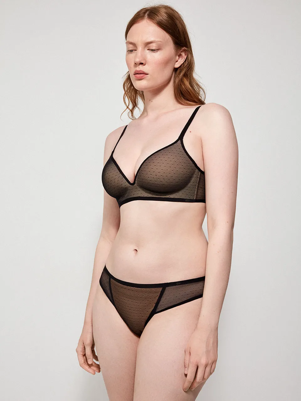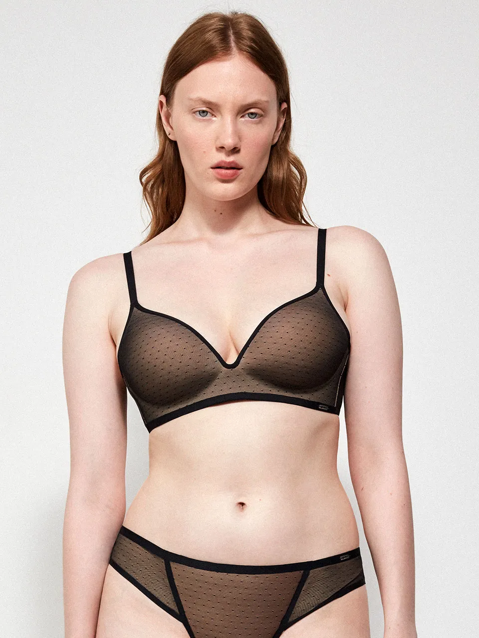 Sujetador sin aro, y copa continua de una pieza que aporta mayor sujeción. Escote pronunciado, ideal para llevar con prendas especiales. Tejido plumetti delicado y femenino, adherido a otro de microfibra que se adapta al cuerpo. Espalda anatómica para minimizar irregularidades. Acabados invisibles y termofusionados que no marcan, y garantizan una gran comodidad.