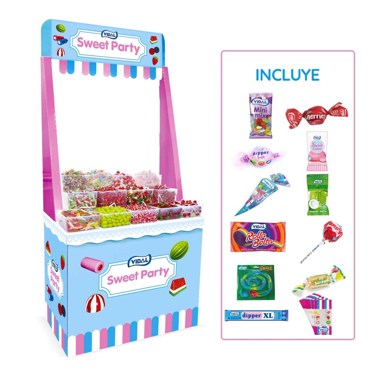 - Mini Mix de azúcar de 75g, bolsa de Soft Fruit azúcar 1Kg, bolsa de Sweet Cakes 200 uds, bolsa de Cherries 200 uds, bolsa de Dipper Balls rellenos 900g, estuche de Pompito cereza 100 uds, Snake Jelly 11 uds, Dipper XL frambuesa 100 uds, Rolla Belta pica unicornio 24 uds, Melones bolsa de 200 uds y 24 Conos Party con mix