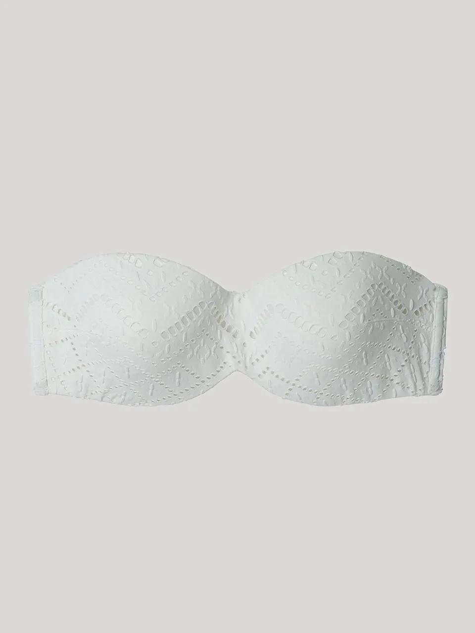 Top bikini bandeau con foam y aro de silicona que permite una mayor sujeción en tejido troquelado. Tirantes desmontables y cierre trasero. Combínalo con su braguita bikini a juego.