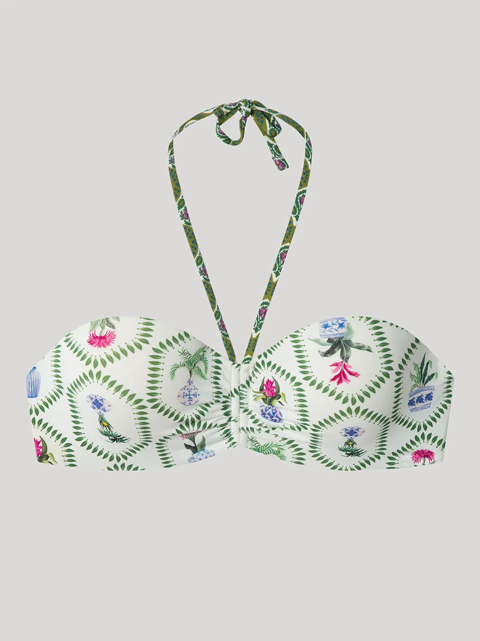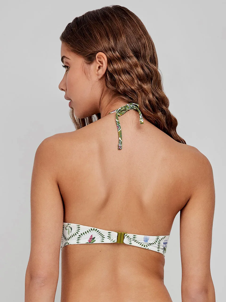 Top bikini bandeau con aro y foam en tejido estampado floral. Detalle de fruncido en escote que estiliza la zona. Disponible en copas B y C. Combínalo con su braguita bikini a juego.