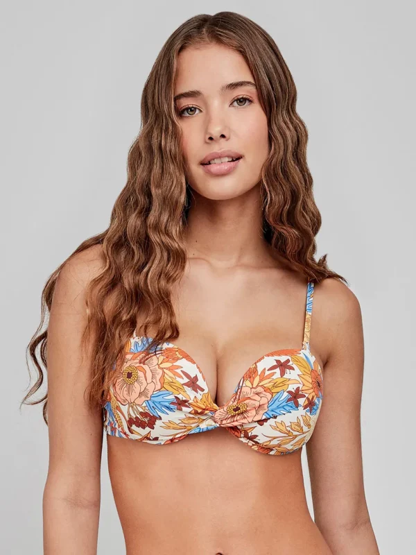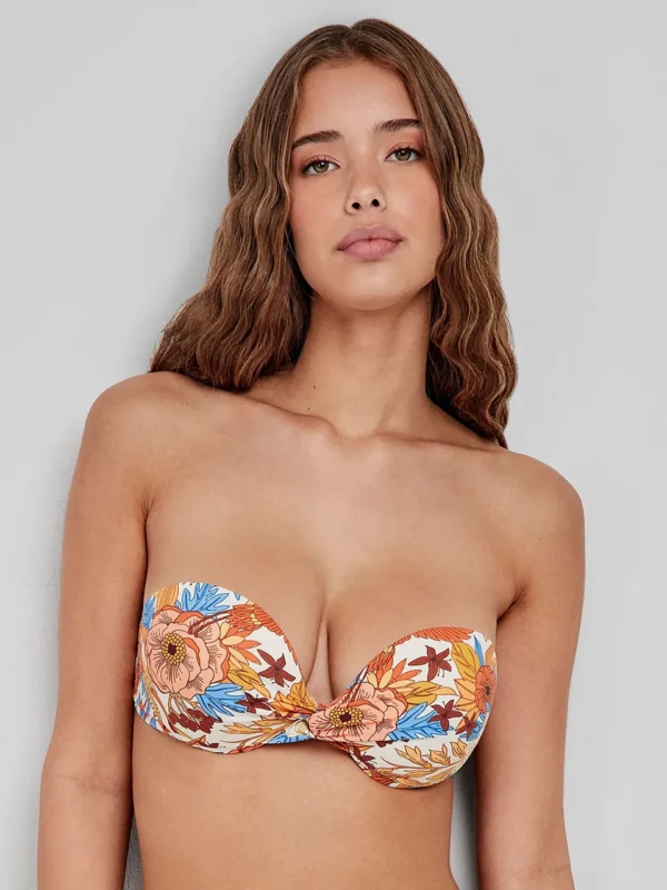Top bikini bandeau con aro y foam en tejido estampado floral. Tirantes desmontables y cierre trasero. Combínalo con su braguita a juego.