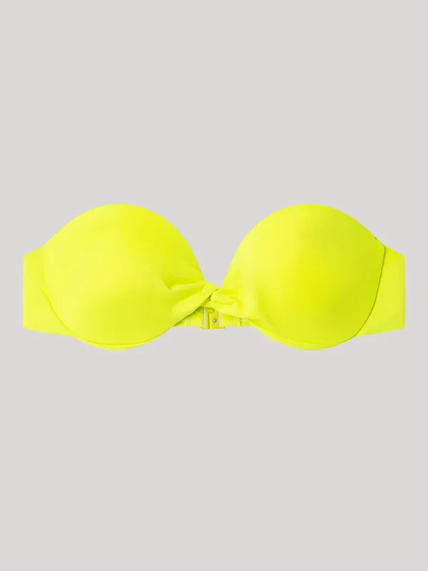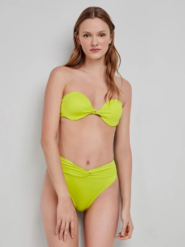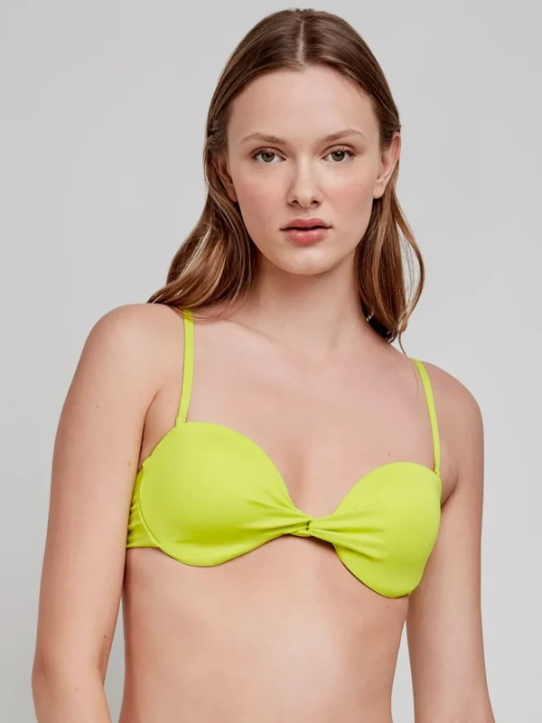 Top bikini bandeau con aro y foam en tejido liso. Detalle de frunce en escote que estiliza la zona. Tirantes multiposición y cierre trasero. Disponible en dos colores. Combínalo con su braguita a juego.