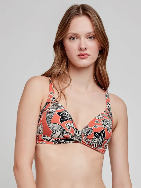 Top bikini capacidad sin aro con foam en tejido estampado. Detalle de escote cruzado que estiliza la zona. Tirantes regulables y disponible en copas C y D. Combínalo con su braguita bikini a juego.