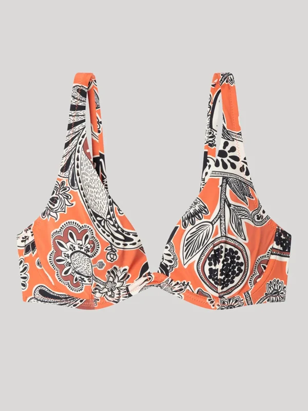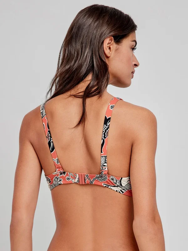 Top bikini capacidad aro sin foam en tejido estampado. Tirantes regulables y cierre trasero. Disponible en copas C y D.