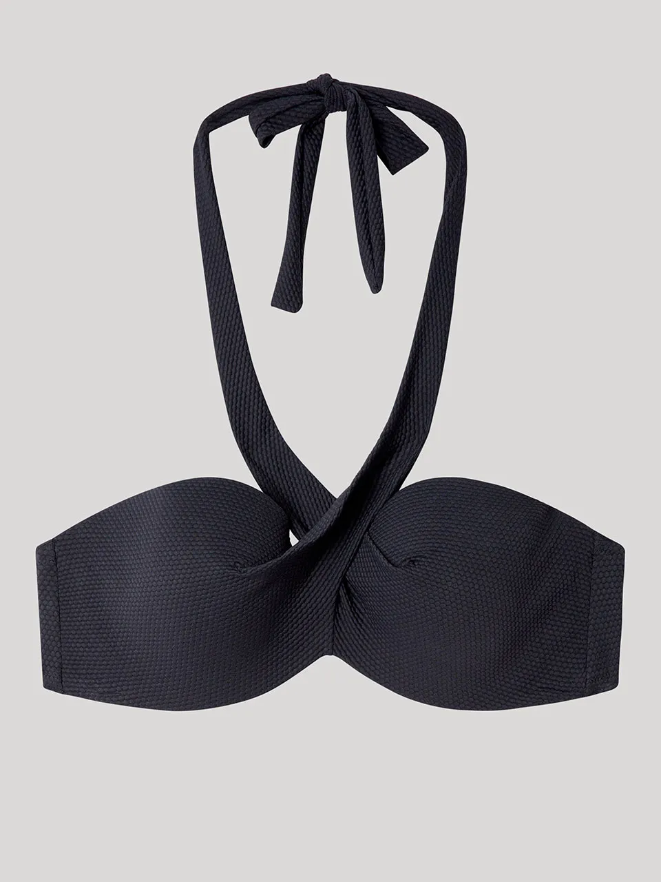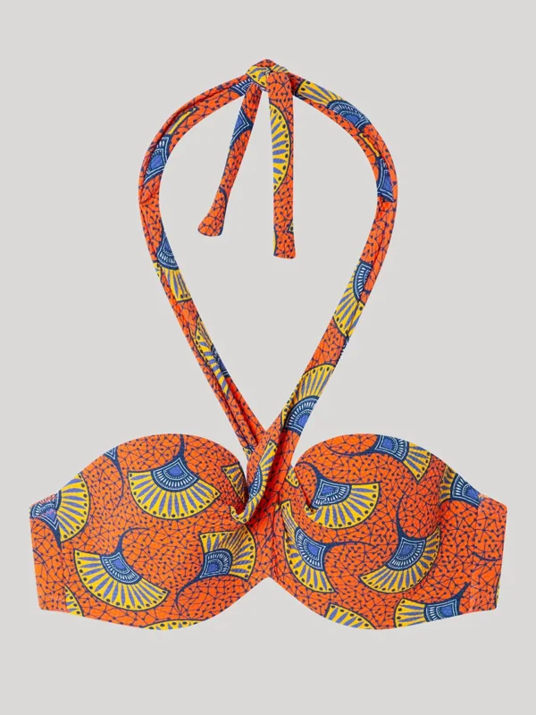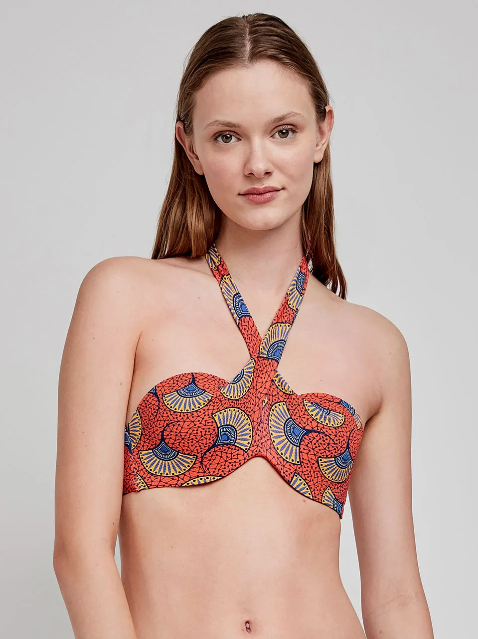 Top bikini multiposición con aro y foam en tejido de estructura anudable al cuello o bandeau, disponible en liso y estampado tribal. En copa B y C. Combínalo con su braguita a juego.