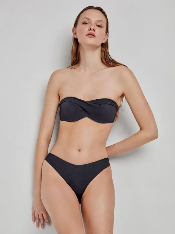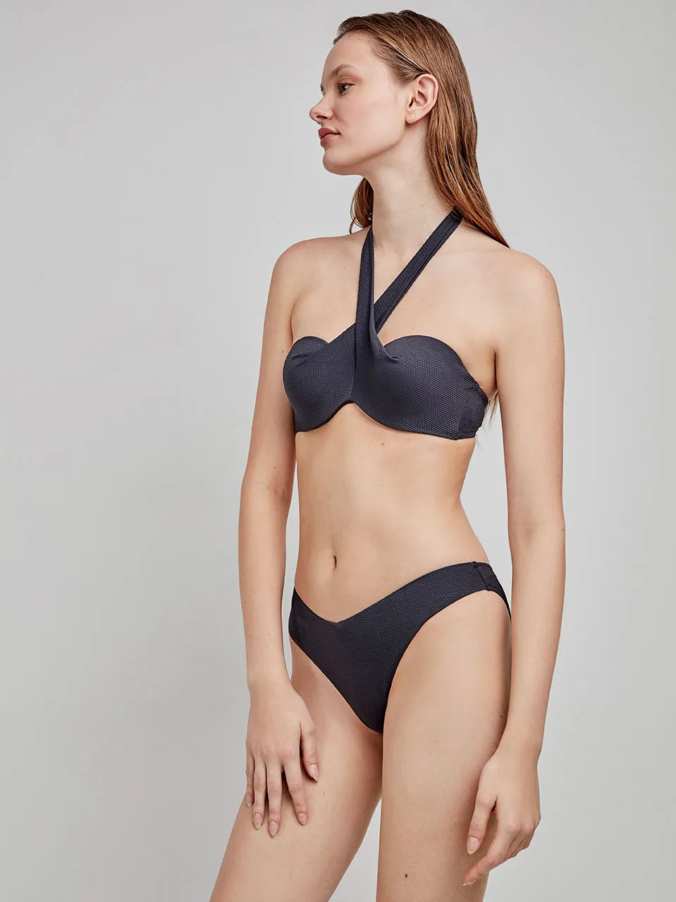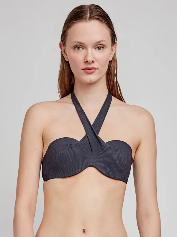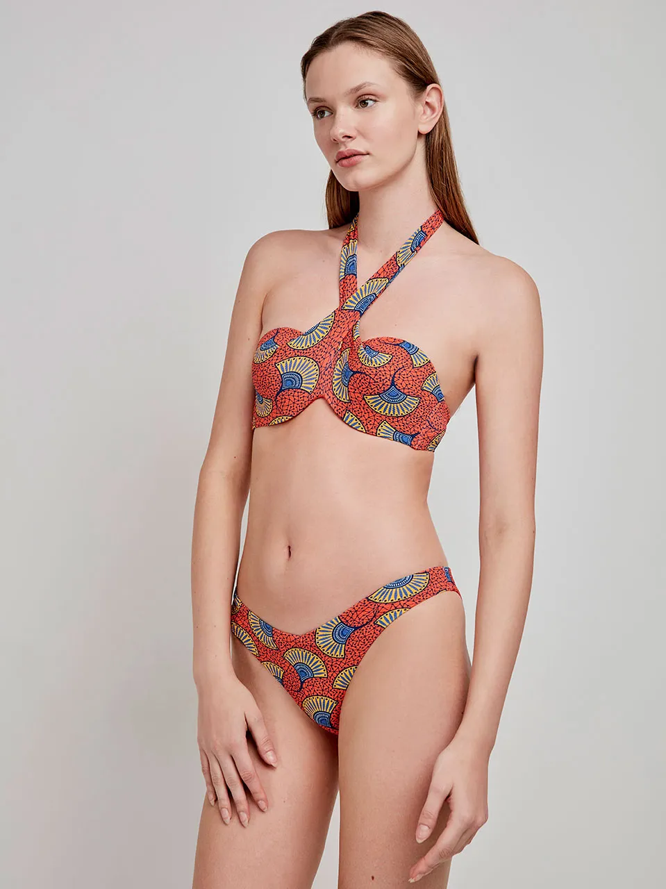 Top bikini multiposición con aro y foam en tejido de estructura anudable al cuello o bandeau, disponible en liso y estampado tribal. En copa B y C. Combínalo con su braguita a juego.