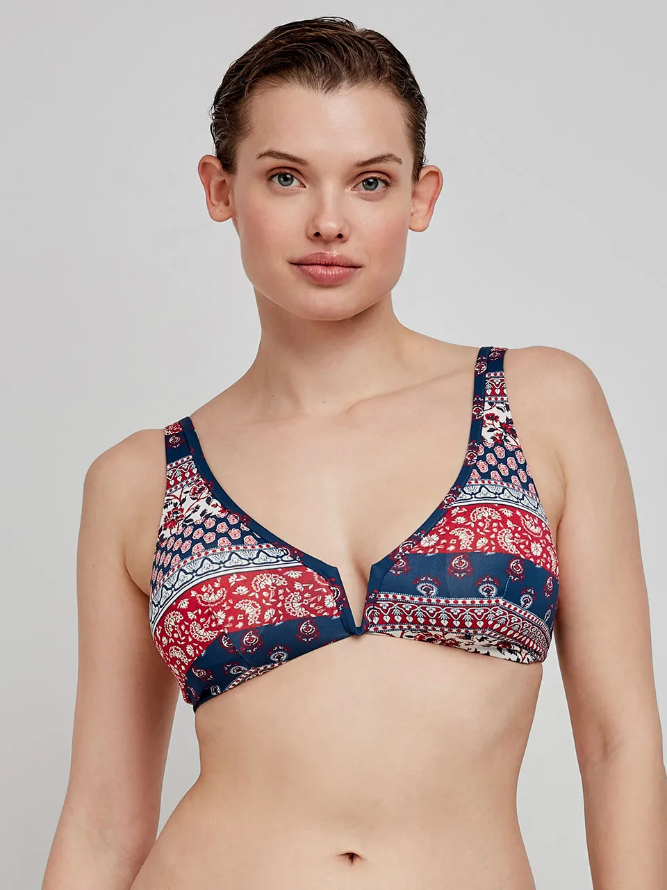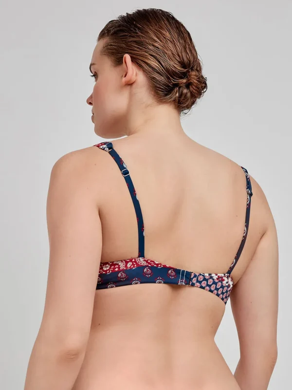 Top bikini capacidad reversible sin aro en tejido estampado étnico. Tirantes regulables y detalle de pieza en escote. Combínalo con su braguita bikini a juego.
