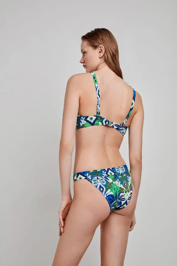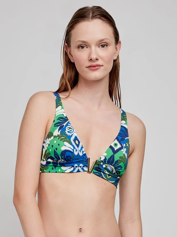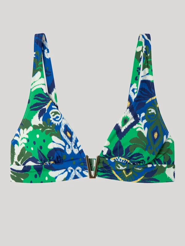 Top bikini triangular sin aro y con foam en tejido estampado tribal. Tirantes regulables, cierre trasero y detalle de pieza dorada en V en escote. Combínalo con su braguita a juego.