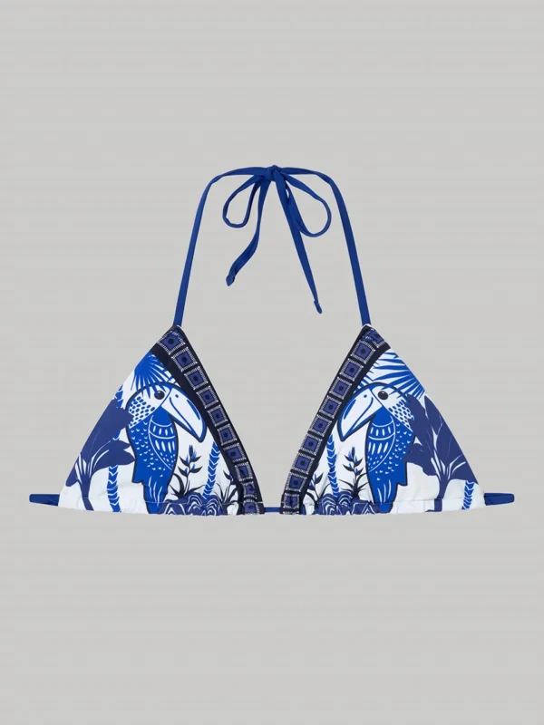 Top bikini triangular sin aro en tejido estampado y detalle cenebra posicionado en bordes. Combínalo con su braguita a juego.