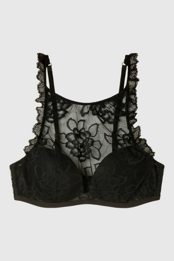 Top con aro y copas de foam en tejido de encaje con detalle de volantes en hombros. Tirantes regulables y cierre trasero. Combínalo con su braguita a juego.