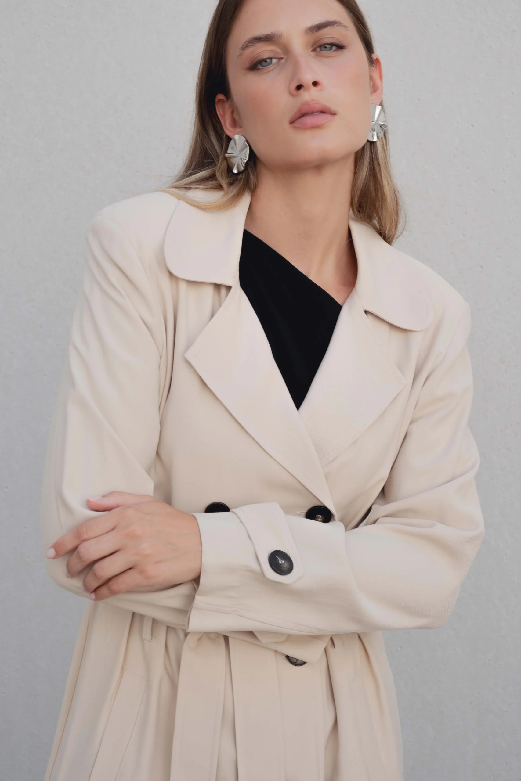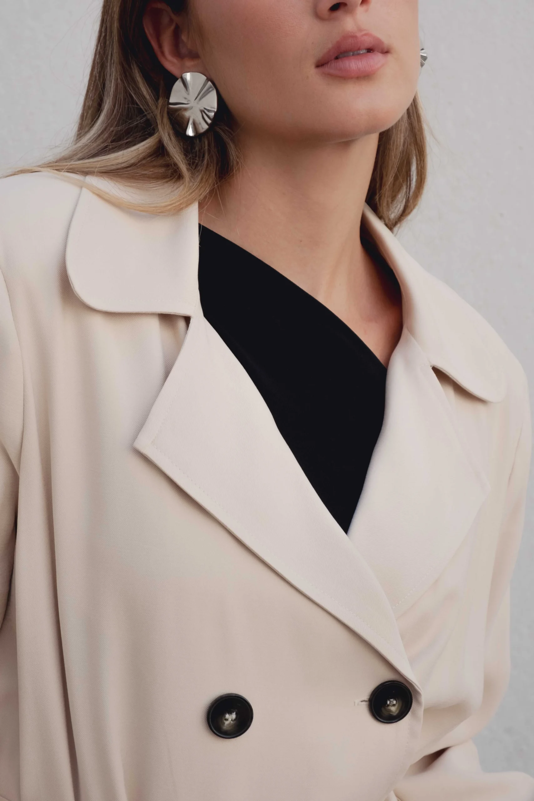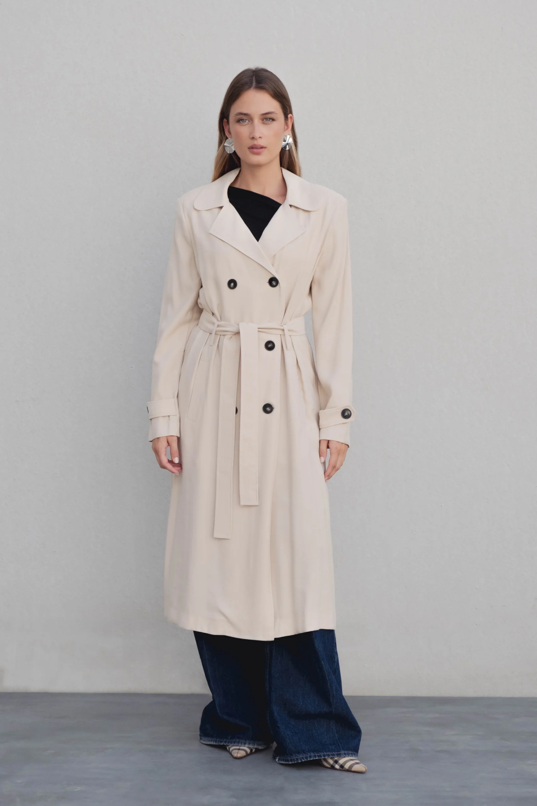 Trench oversize de cuello solapa y manga larga con trabilla y botón. Bolsillos delanteros. Cinturón en mismo tejido ajustable con lazadas. Bajo acabado con abertura en espalda. Cierre frontal con botones ocultos por solapa.